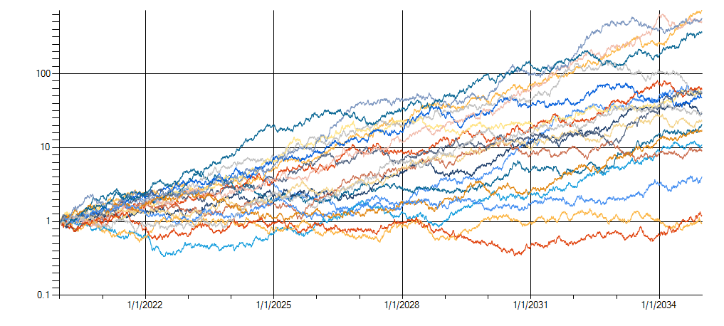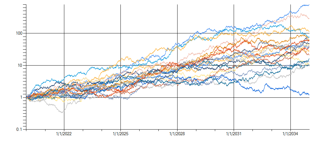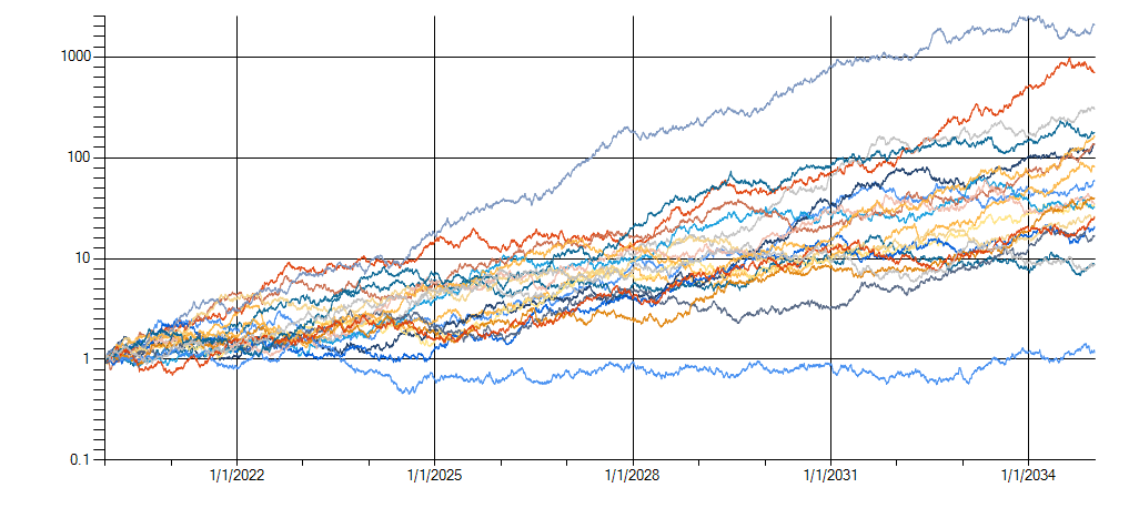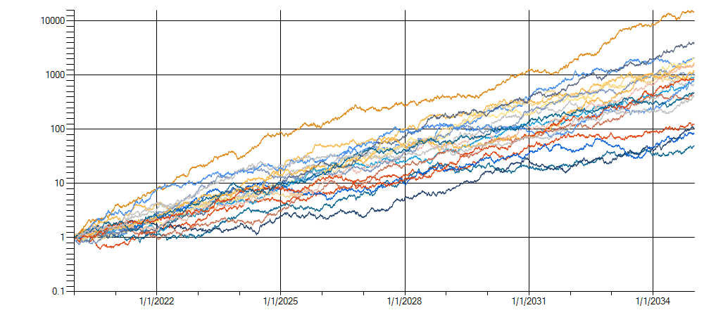 В очередной раз, сделав несбыточное предположение о стационарности и нормальности распределения результатов, посмотрим, что будет получаться на довольно большом сроке при заданных доходности и волатильности.
