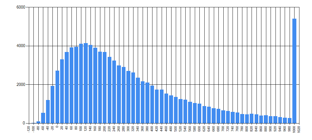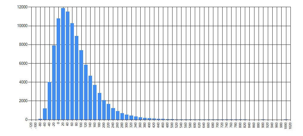 Посмотрите насколько отличаются эти линии. Можно также посмотреть на гистограмму итоговых результатов и помедитировать над ней. Картинки с несколькими примерами в конце статьи, каждую можно кликать, чтобы увеличить. Кроме того, на сайте есть сервисы и для визуализации динамики капитала и для просмотра гистограмм распределения результатов - вы можете "поиграться" с ними вживую, задавая свои параметры и изучая получающиеся результаты. Задумайтесь над тем, насколько огромен итоговый разброс, вы можете сделать прекрасную систему с прекрасными матожиданием и дисперсией, но результат очень сильно зависит просто от случайности, от везения. Хотя, разумеется, при положительном матожидании и большом сроке выбор будет между хорошим и очень-очень хорошим, что не может не радовать.