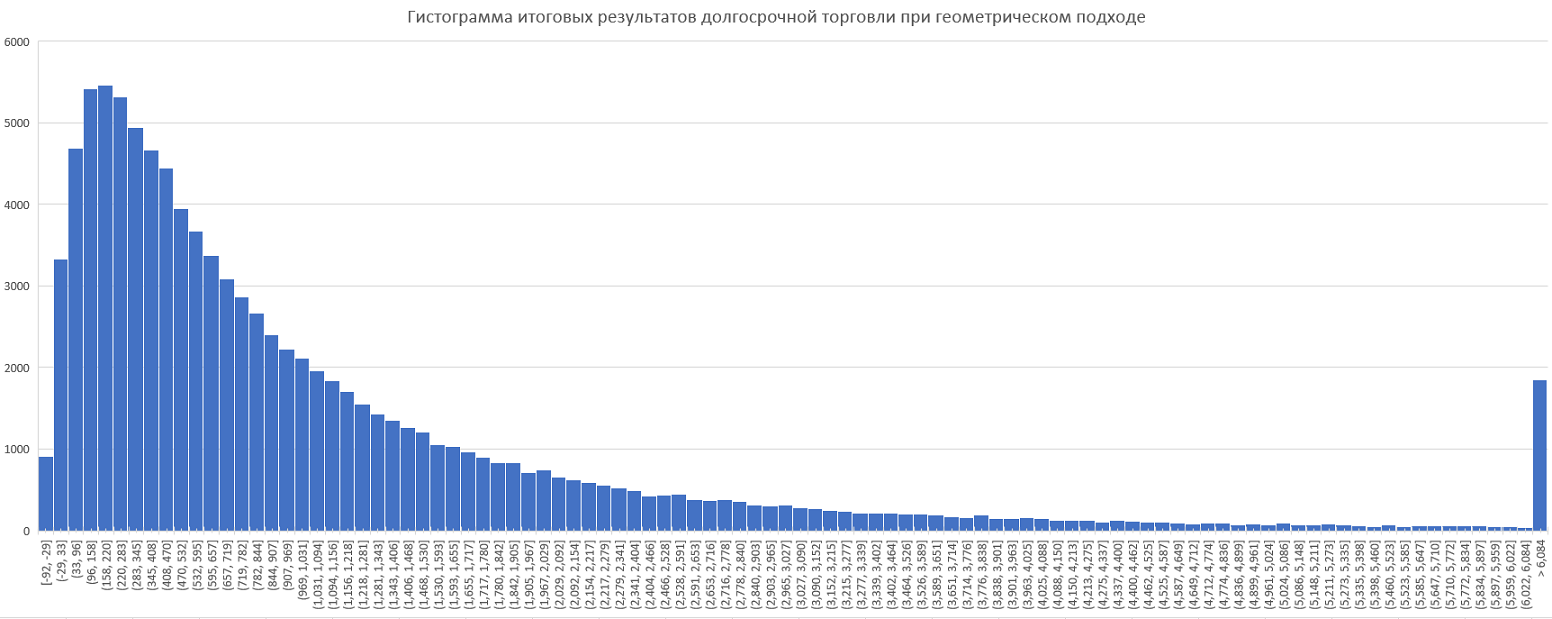 На картинке ниже представлена гистограма итоговых результатов при долгосрочной торговле одной хорошей системы с использованием геометрического подхода. Дисперсия очень высокая. На картинку можно кликнуть.