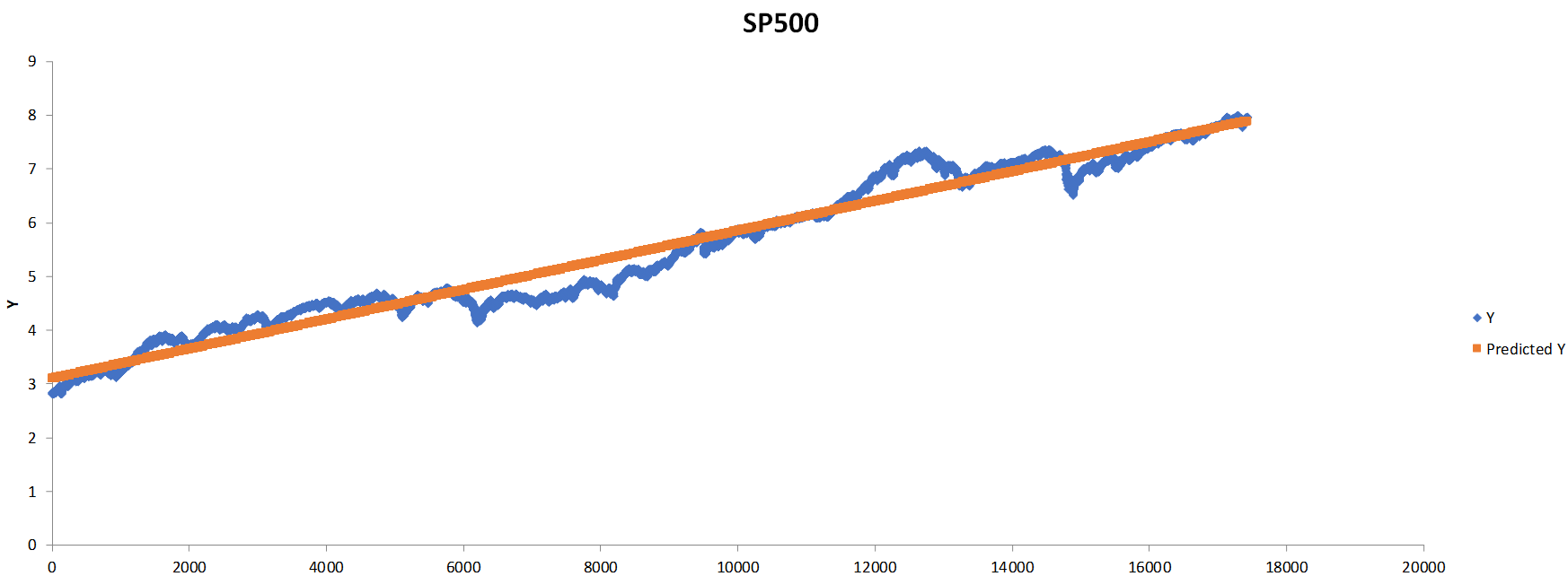 Уже 10 лет рынок США растет, хотя и иногда спотыкается ненадолго. Но прежде чем видеть в этом пузырь и решать что вот-вот грянет депрессия, стоит задуматься о том, что в нулевые годы случилось два серьезных кризиса, по сути это "потерянное десятилетие" для инвесторов. Мы сейчас нагоняем упущенное. Так что я не сильно удивлюсь, если бычий рынок продолжится и дальше. Ниже картинка индекса SP500 в логарифмическом масштабе, как положено, попробуйте найти здесь пузырь. По абсциссе - дни с 1950го года, не дошли руки нормально даты вывести; линейная регрессия сделана по всем правилам. На картинку можно кликнуть.